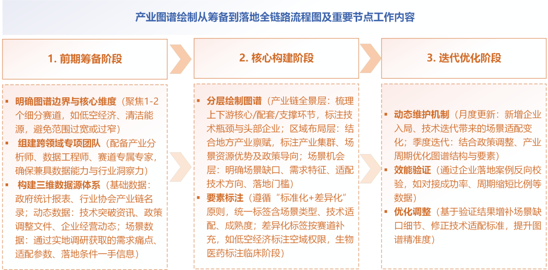 需要特别注意的是产业图谱并非静态文档,需建立“月度更新+季度迭代”的动态维护机制。月度更新聚焦动态数据与场景微调,涵盖新增企业入局、技术突破带来的场景适配变化等内容;季度迭代则结合政策调整、产业周期变动,优化图谱结构与要素标注。同时,还应建立效能验证机制,通过企业落地案例反向校验图谱精准度。